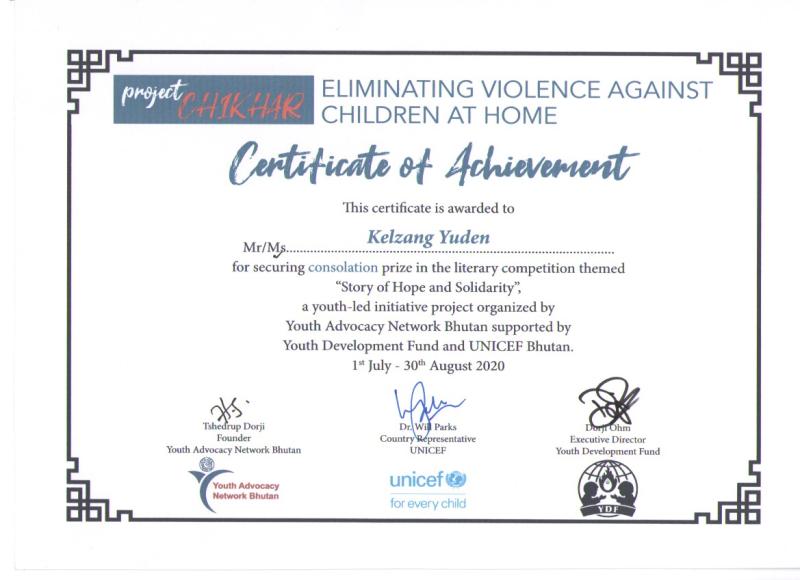 Certificate of Achievement for Literary Contest themed "Story of Hope and Solidarity", a Youth-led initiative project organized by Youth Advocacy Network Bhutan, supported by Youth Development Fund and UNICEF Bhutan.