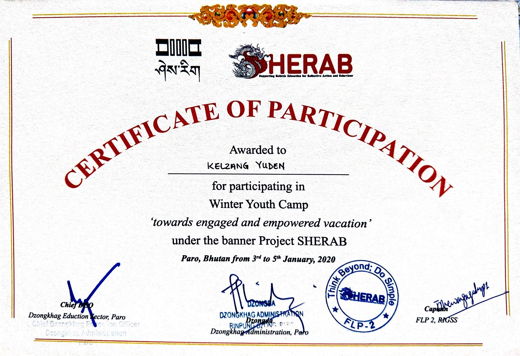 Participated in Winter Youth Camp, conducted by Paro Dzongkhag Administration, Bhutan, aimed towards an engaged and empowered vacation.